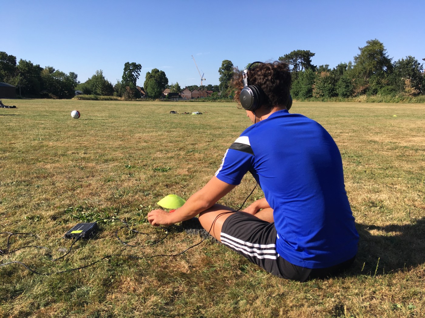 At the closing event for the Get Some Chalk On Your Boots! exhibition at the Glass Tank sound artists Shirley Pegna and Paul Whitty will be investigating the seismic activity generated by footballers as they move across the turf; as they make a sudden change of direction; jump for a header or fall to the ground. They will be testing out their new work footfall with footballers from local grassroots teams and inviting the audience to listen to the sound of the footballers articulating the space. You can experience footfall from 1.00-2.00 outside the Glass tank gallery at Oxford Brookes University. Here is some documentation of tests Shirley and Paul made earlier in the week: